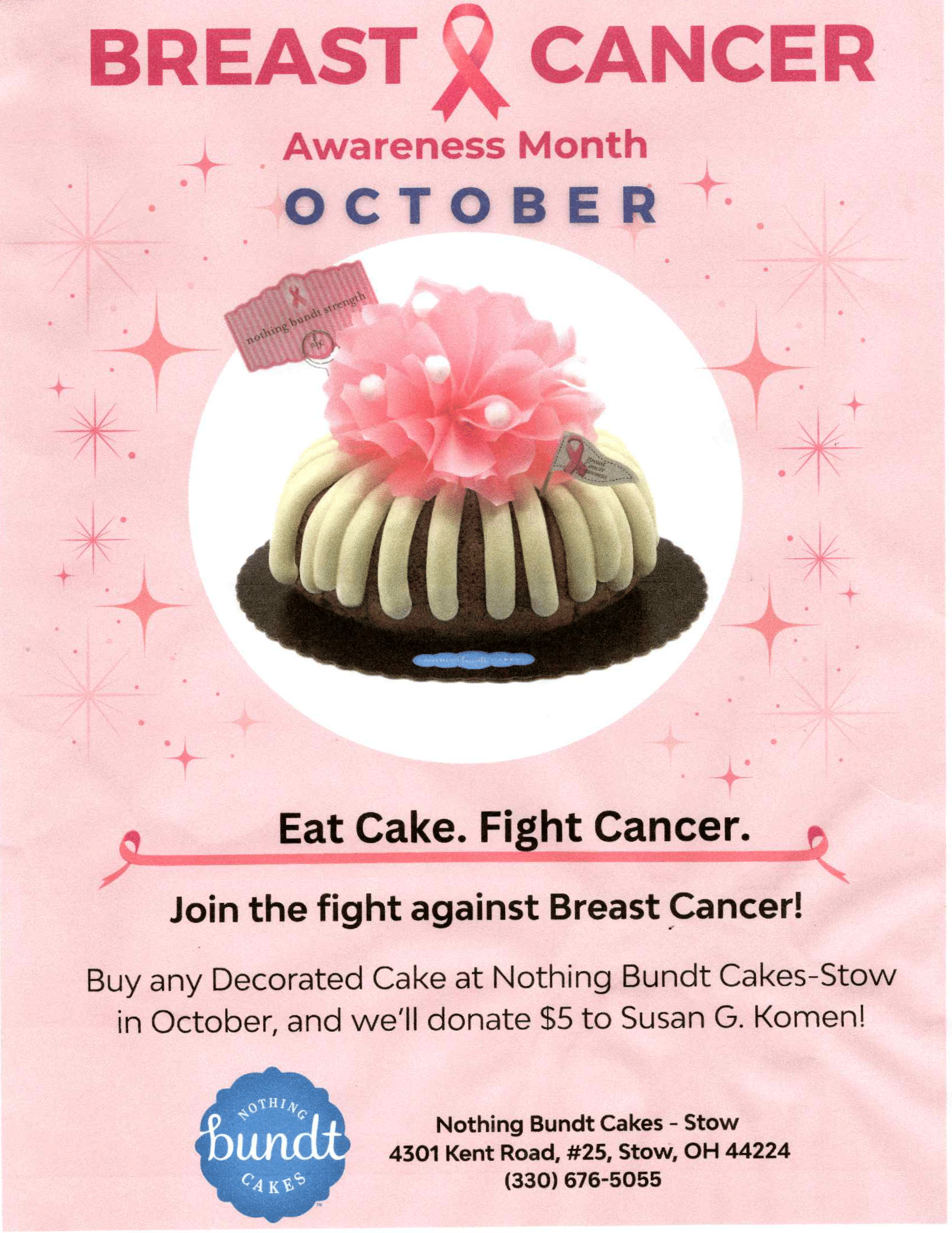 Nothing Bundt Cakes in Stow dropped off a large bundt cake for our employees and asked us to pass along this flyer for their October special for Breast Cancer Awareness Month. I must say, I split the whole bundt cake they delivered with all the employees to take home with them to their families! It was amazing!! It was chocolate, chocolate chip with cream cheese frosting! So good!